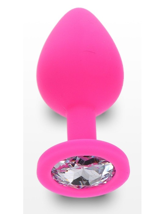 Le plug bijou Diamond Booty M est rose avec un bijou roind brillant.La surface est lisse.Avec une longueur insérable de 7 cm et une largeur maximale de 3.5 cm. En silicone