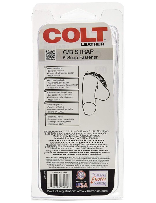 Le cockring de la marque Colt est ici en cuir muni de 5 pressions permettant d'ajuster au mieux le serrage de cet anneau pénien. Contrôler plus efficacement votre érection et donnez toute la puissance à celle-ci