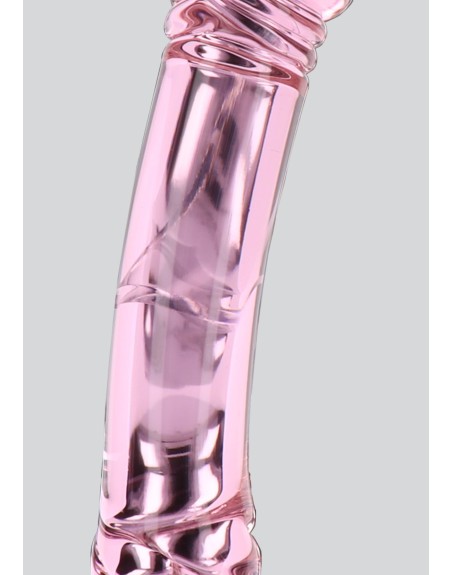 Gode en verre rose avec double insertion.Un côté possède une forme réaliste. L'autre a une surface torsadée.