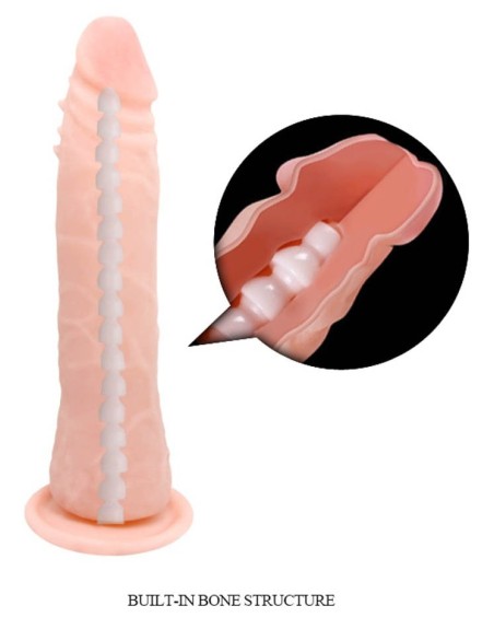 une forme légèrement courbée avec le gland décalotté la longueur insérable de 18cm une largeur allant de 3 à 4.5cm une surface veinée avec quelques picots à l'extrémité.Avec une ventouse.