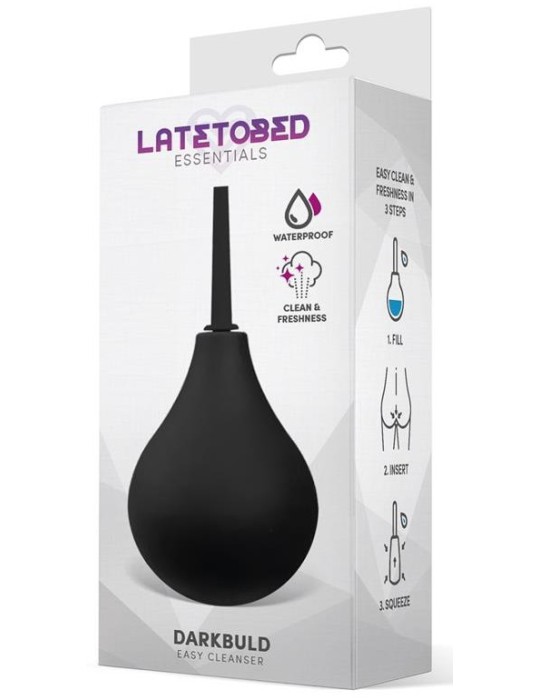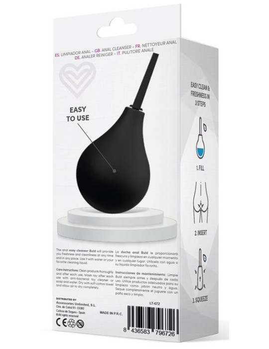 Cette poire anale Buld Easy noire est un accessoire conçu pour le lavement anal.Elle se compose d'un réservoir en silicone qui se remplit d'eau facilement.L'embout est de 6cm de longueur avec une largeur de 6mm. Dimensions totales 14 x 6cm