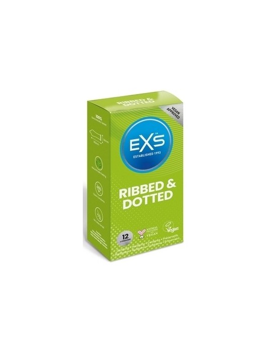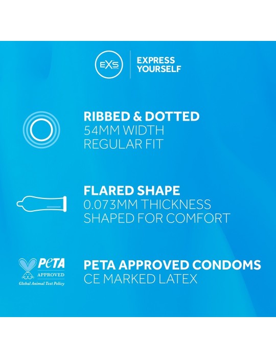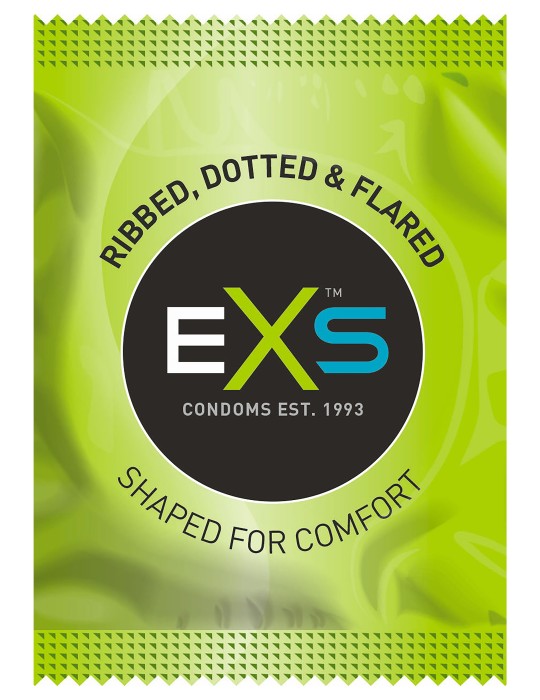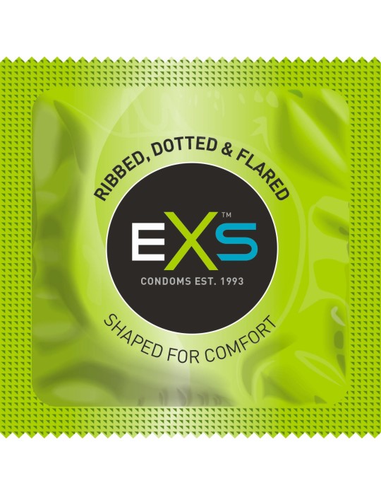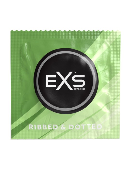 Ces préservatifs texturés sont proposés par la marque EXS. Ils sont composés d'une surface pointillée et nervurée. Les sensations sont alors augmentée.Ils sont conçus en latex. Déjà lubrifiés (gel silicone) Longueur d'environ 19.5cmLargeur nominale 56mm