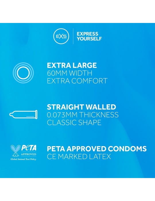 Ces préservatifs en latex ont une taille XXL. Ils permettent d'assurer une meilleure aisance et de prendre du plaisir.Ils sont composés d'une forme droite avec réservoir et d'une surface lisse déjà lubrifiée. Longueur de 21cm. Largeur de 60mm. Épaisseur de 0.063mm