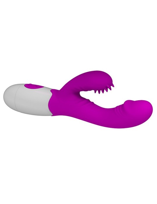 Le vibromasseur rabbit André est composé de 2 parties : La partie insérable de 10 cm doté de 7 modes de vibrations pour stimuler votre vagin et votre point G La seconde est l'ergot à picots qui possède 3 modes de vague pour masser intensément votre clitoris. Ces 2 combinaisons vous feront atteindre l'orgasme en un temps record. En silicone, il fonctionne avec 2 piles LR03 (non fournie).