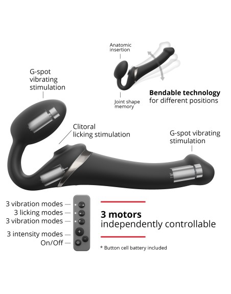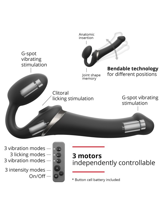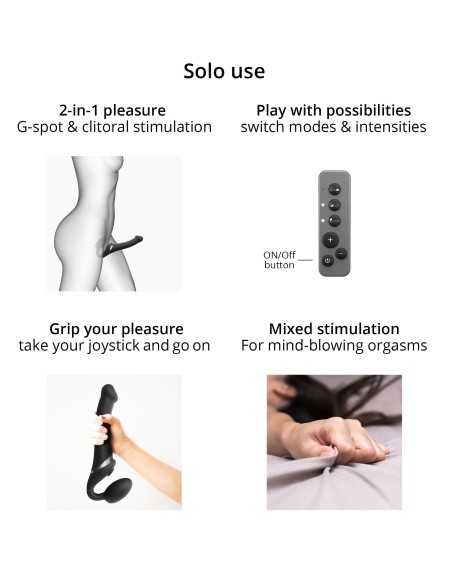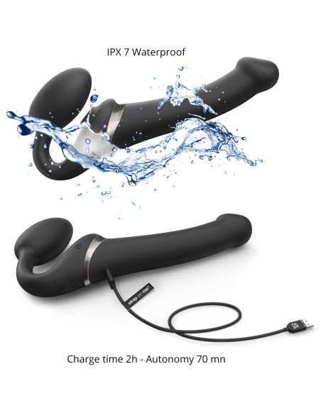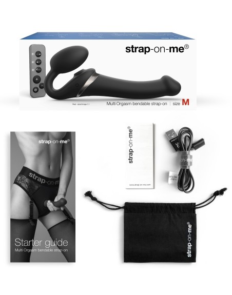 Ce sextoy MULTI ORGASM de la marque Strap-On-Me est proposé sur le sex shop dans sa version S et couleur noire.Il est utilisé comme gode-ceinture sans harnais. Celui-ci se maintient grâce au plug de 4cm de largeur. La partie vibro mesure 14.5 x 3.4cm.Il possède également un stimulateur de clitoris. Il dispose de 3 moteurs indépendants, 3 rythmes de vibrations et 3 vitesses.